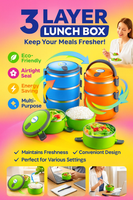 Upgrade your mealtime experience with the 3 Layer Lunch Box, designed to keep your food fresh, warm, and neatly packed wherever you go. Featuring three spacious compartments, this eco-friendly lunch box is perfect for carrying a variety of meals—rice, curry, salad, snacks, and more—all in one compact design.