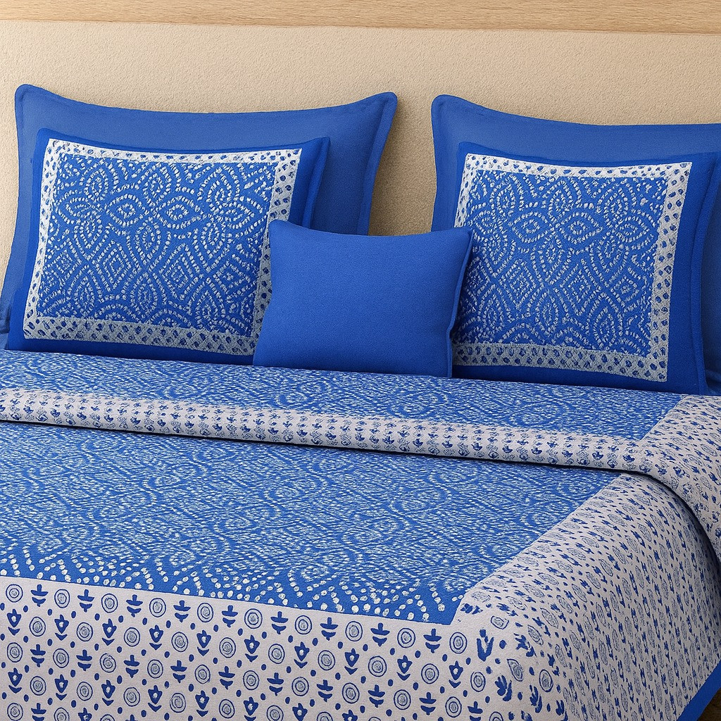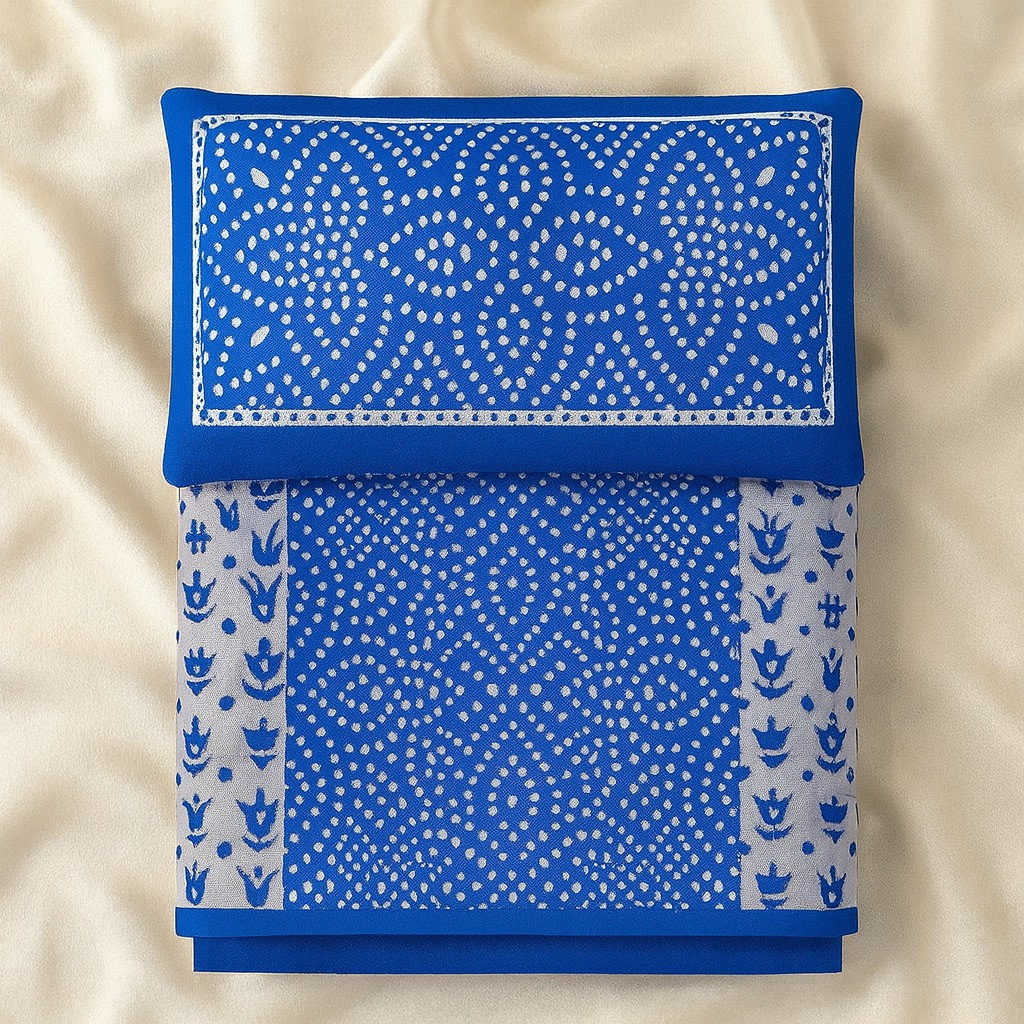 Give your bedroom a refreshing makeover with this royal blue cotton double bedsheet set. Designed with elegant dotted patterns and a floral-inspired border, this bedsheet beautifully combines traditional charm with modern simplicity. Made from soft and breathable cotton, it offers superior comfort, durability, and a restful sleep experience. The set includes two matching pillow covers with coordinated patterns to complete the look, making your bed the centerpiece of your room.