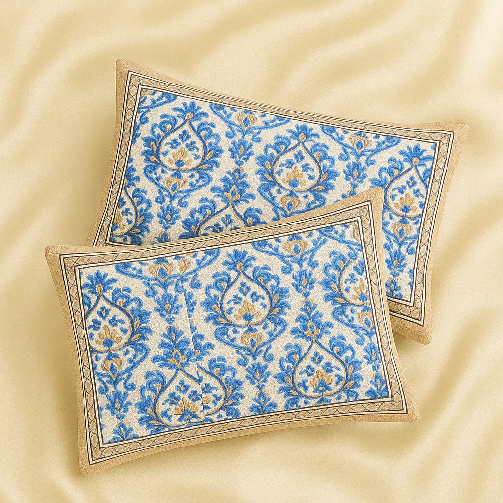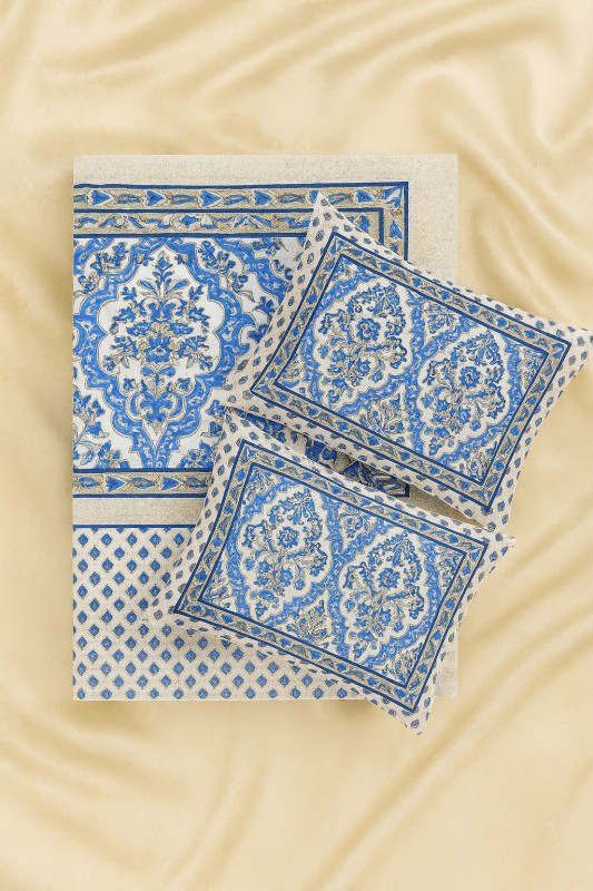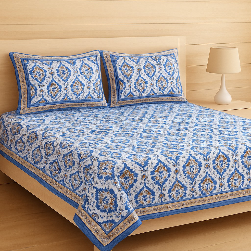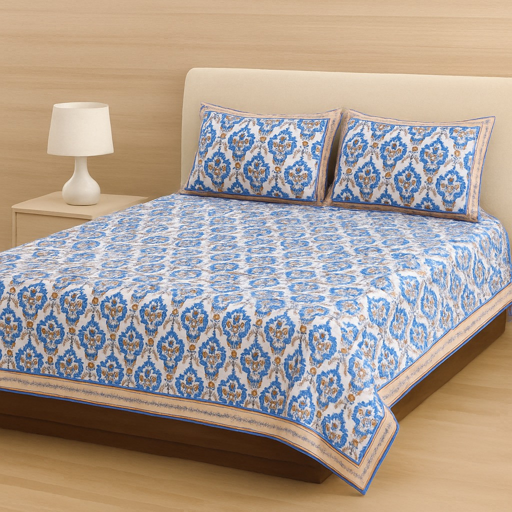 Enhance the beauty of your bedroom with this elegant blue and beige ethnic print cotton bedsheet set. The intricate floral and paisley-inspired motifs give it a royal and timeless look, while the soft cotton fabric ensures superior comfort and breathability. Designed with a detailed border and all-over print, this bedsheet is perfect for adding a touch of sophistication to your décor. The set includes two matching pillow covers to complete the coordinated look, making it suitable for daily use, festive décor, or gifting.