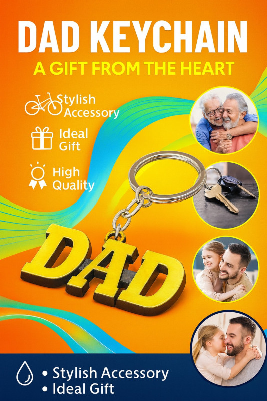 Celebrate your love and appreciation with the DAD Keychain – A Gift from the Heart. Crafted with a premium metallic finish, this stylish accessory features bold “DAD” lettering in a golden hue that makes it stand out as a thoughtful and timeless keepsake. Durable, lightweight, and practical, it’s perfect for everyday use while carrying keys securely.