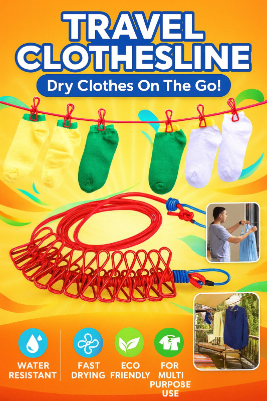 Make drying clothes on the go simple and convenient with the Travel Clothesline with Clips. Perfect for home, outdoor, and travel use, this strong and flexible clothesline comes with built-in clips to securely hold your clothes, socks, and towels.