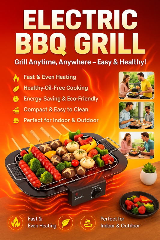 Enjoy the taste of delicious barbecue anytime with the Electric BBQ Grill, designed for fast, even, and oil-free cooking. This compact and portable grill is perfect for grilling vegetables, meat, fish, and skewers both indoors and outdoors without smoke or mess.