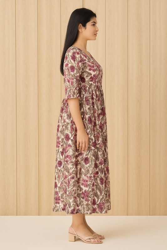Make a chic statement with this Beige Floral Printed Maxi Dress. Designed with an all-over maroon and brown floral pattern, this dress radiates elegance and sophistication. Featuring a round neckline, half sleeves, and a flowy maxi length, it offers both style and comfort. Crafted from breathable fabric, this dress is perfect for casual outings, festive occasions, and everyday wear. Its flattering silhouette enhances your look while keeping you effortlessly graceful.