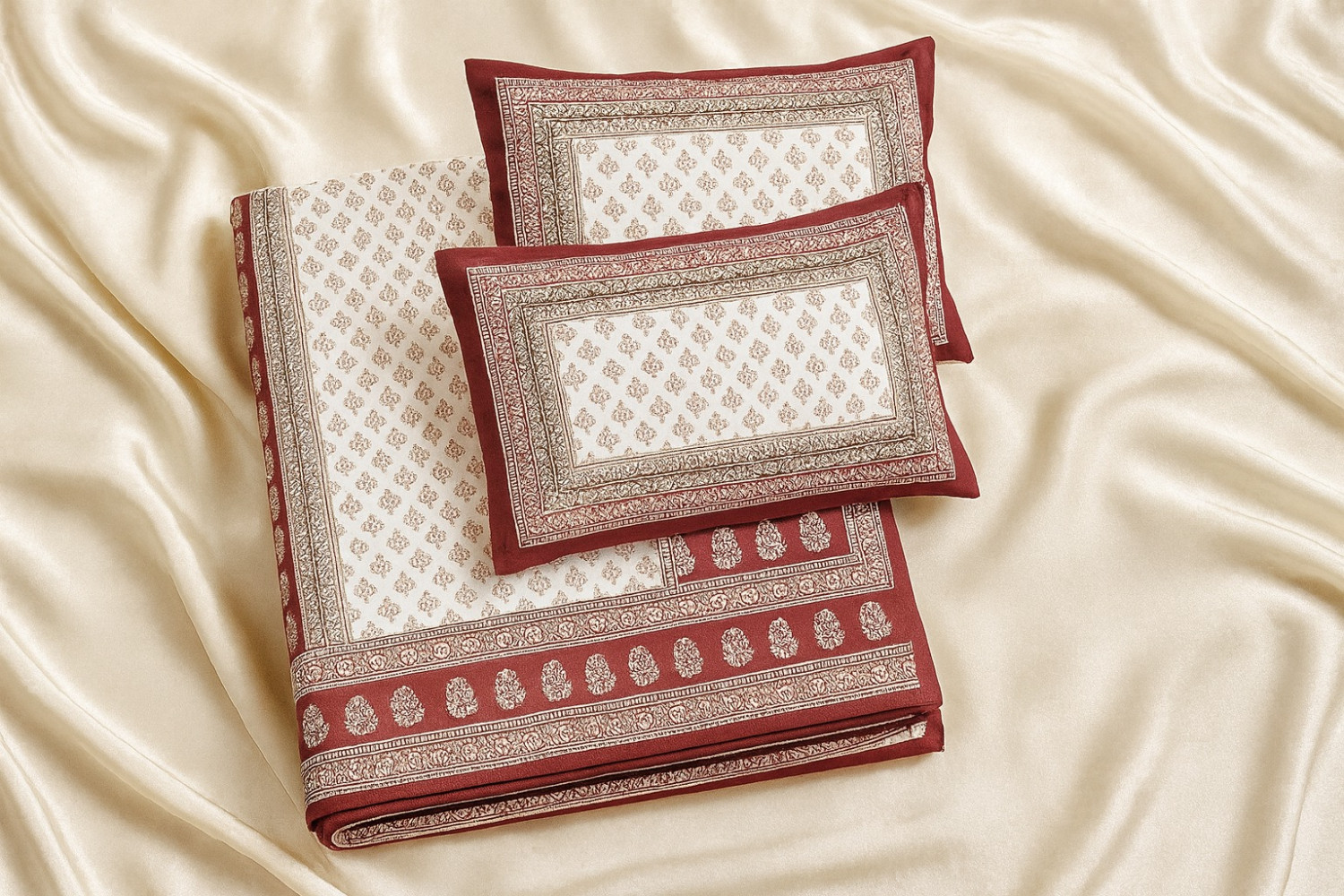 The ethnic-inspired border design with traditional motifs adds a touch of sophistication and blends seamlessly with modern or traditional bedroom décor. The set includes two matching pillow covers to complete the elegant look.