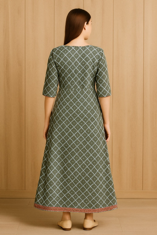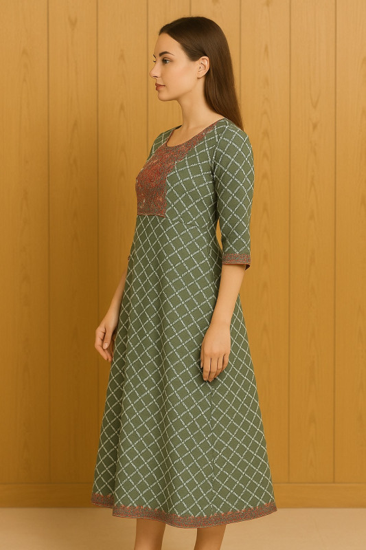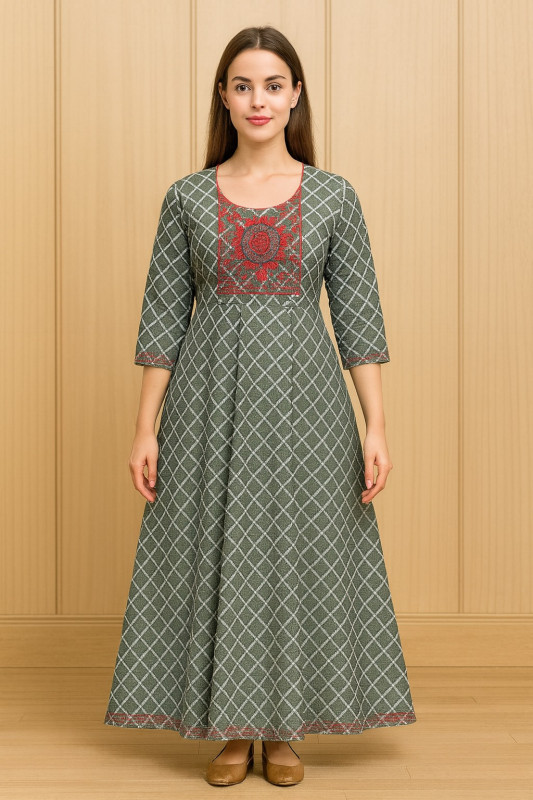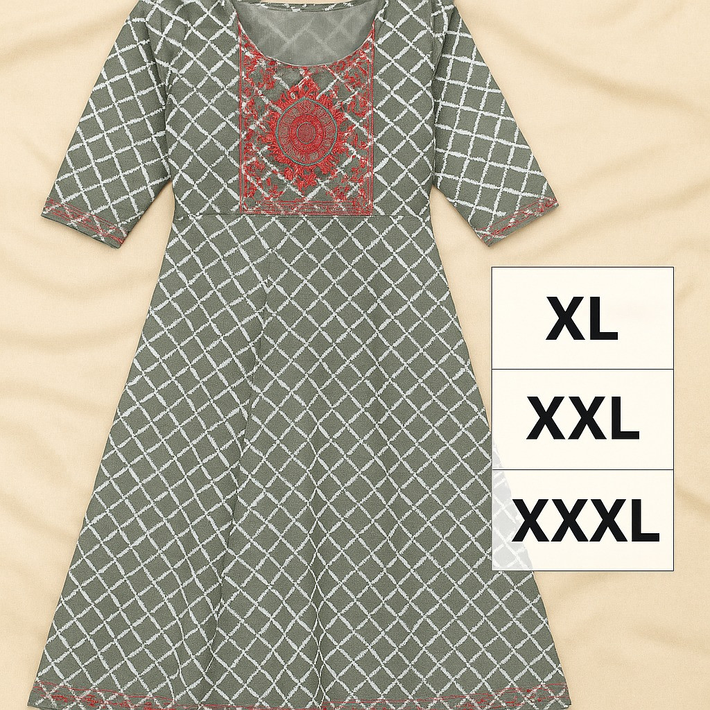 Upgrade your ethnic wardrobe with this stylish olive green Grown, featuring a classy all-over geometric print and beautifully detailed red embroidery on the yoke. Designed with a comfortable A-line silhouette, this kurti is perfect for both everyday wear and festive occasions. The 3/4th sleeves with contrast embroidered borders add a touch of elegance, making it a versatile choice for work, casual outings, and small celebrations.