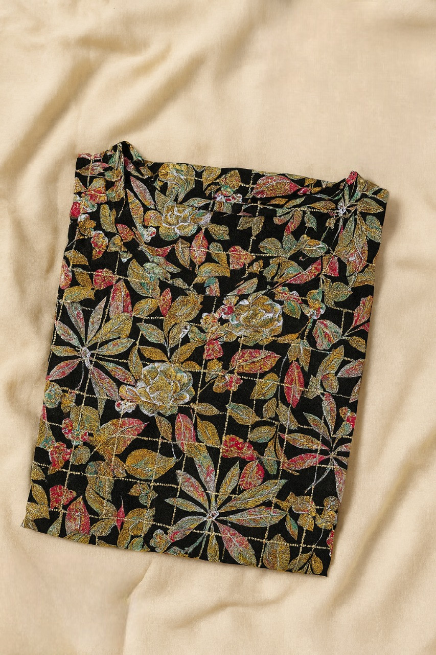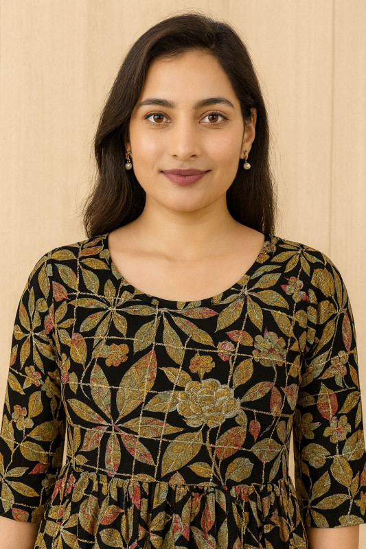 This chic and elegant floral print dress combines the timeless beauty of nature with a contemporary twist. Crafted from breathable fabric, this dress features a flattering silhouette with a soft empire waist. The rich black backdrop is adorned with vibrant floral patterns in gold, red, and green, perfect for any casual outing or evening gathering. Its 3/4 sleeves provide extra comfort, and the flowy design allows freedom of movement, making it an ideal pick for every season.
