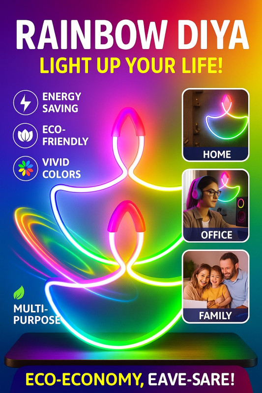 Bring home positivity, style, and vibrant energy with our Rainbow Diya LED Light – a stunning modern twist on the traditional diya! Designed with vivid multi-color LED lights, this eco-friendly lamp creates a mesmerizing glow that enhances any space — whether it’s your home, office, or festive celebration.