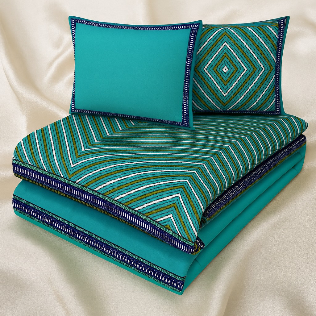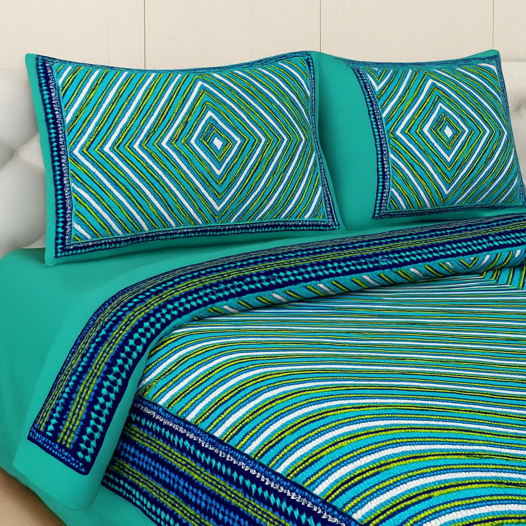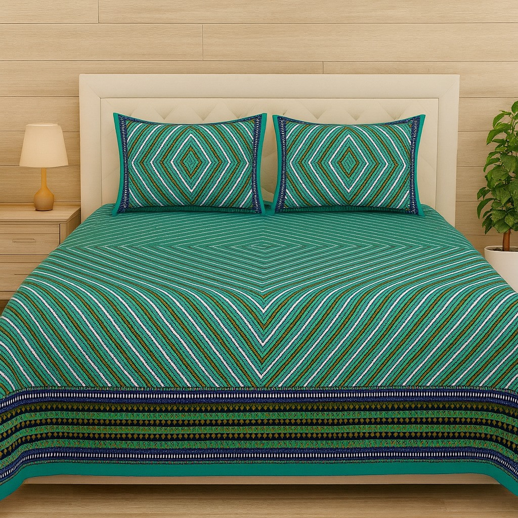 Give your bedroom a fresh, modern look with this green and blue striped cotton double bedsheet set. Featuring bold diagonal stripes forming a diamond pattern in the center and a detailed border, this bedsheet combines contemporary style with traditional elegance. Made from premium quality cotton, it ensures softness, breathability, and durability for everyday comfort. The matching pillow covers with a coordinated diamond-striped design complete the set, making your bed stylish and inviting.