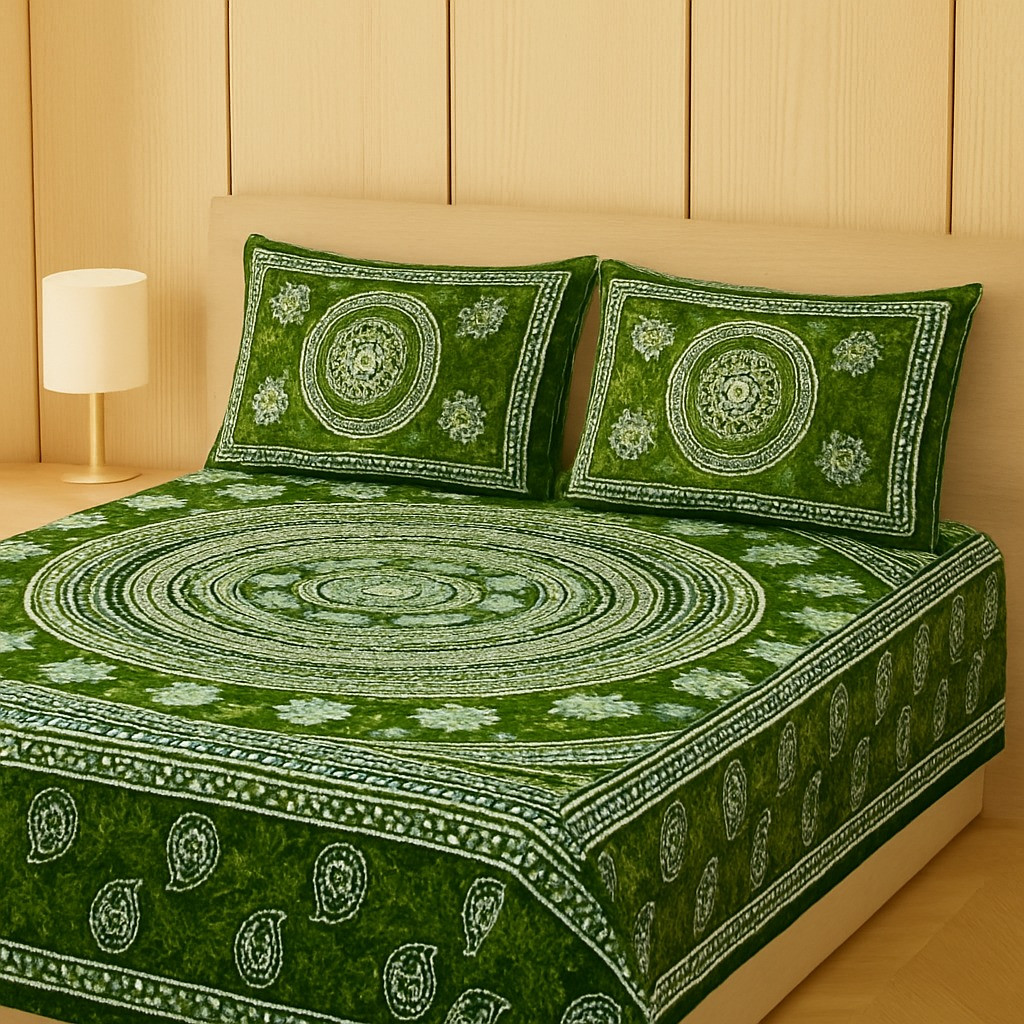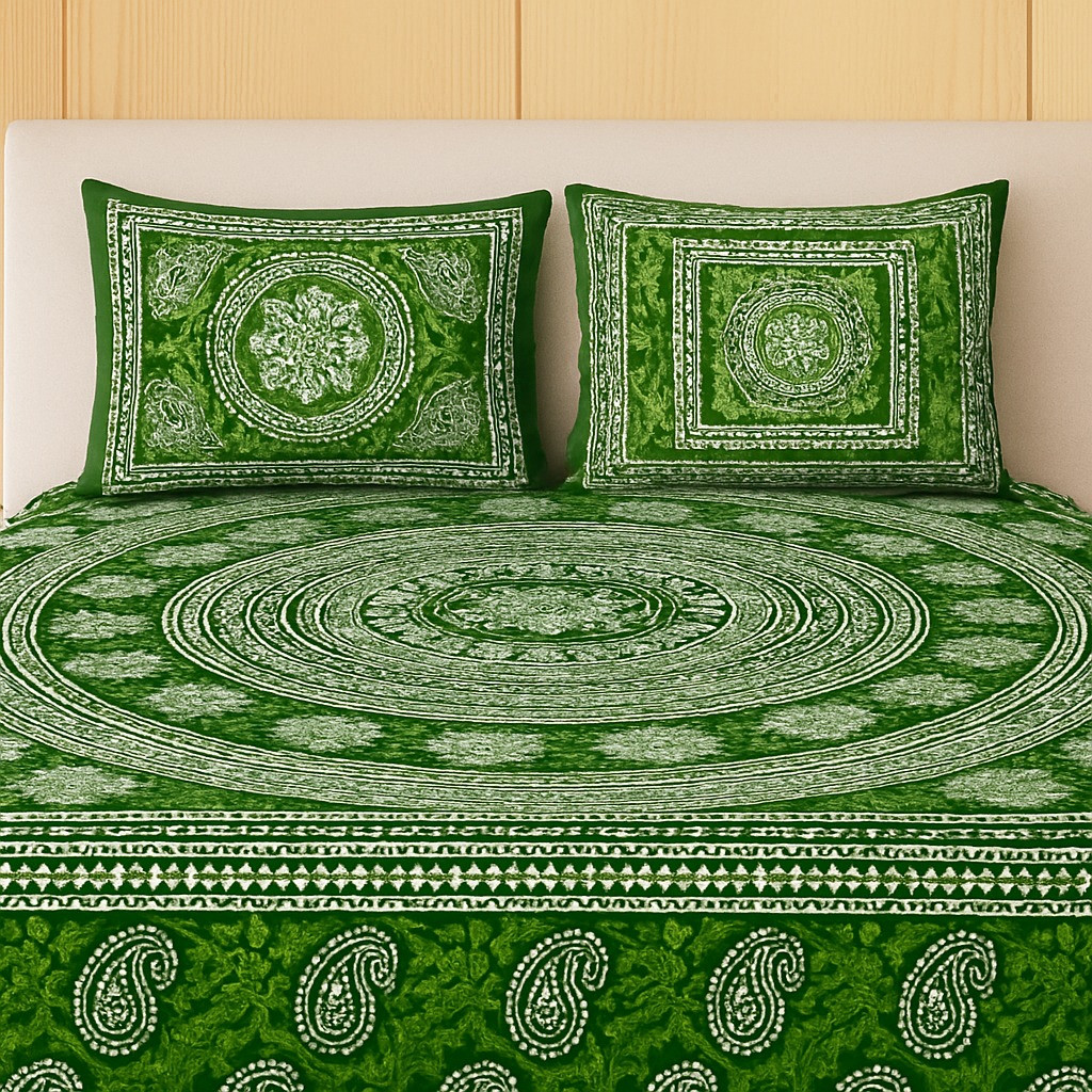Give your bedroom a refreshing makeover with this elegant green mandala print cotton bedsheet set. Featuring intricate circular mandala patterns and ethnic motifs, this bedsheet blends traditional charm with modern elegance. Crafted from soft, breathable cotton fabric, it ensures maximum comfort and durability. The coordinated pillow covers with matching designs complete the set, making it a perfect choice for daily use, festive décor, or gifting.
