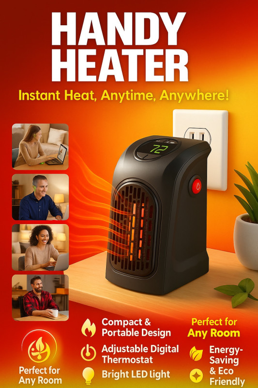 Stay warm and cozy with the Handy Heater, your compact solution for instant heat anytime, anywhere. This plug-in electric heater is designed with a portable and space-saving design, making it ideal for bedrooms, offices, living rooms, or any small space.