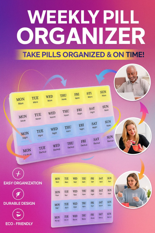 Never miss a dose again with our Colorful Weekly Pill Organizer. Designed with 4 compartments per day (Morning, Noon, Night & Backup), this pill box makes managing your daily medication simple, easy, and stress-free.