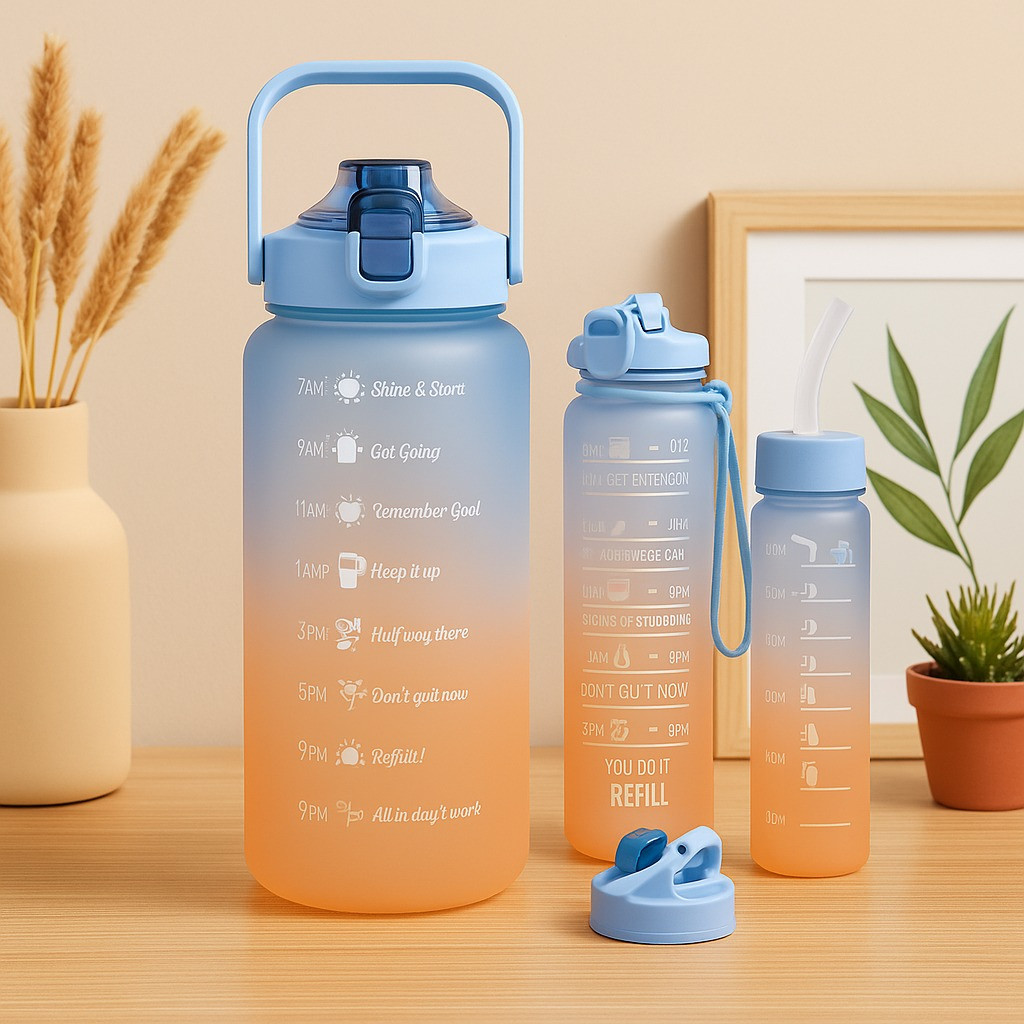Stay hydrated all day with the Hydration3 3-in-1 Water Bottle Set – your perfect hydration companion! This set includes three gradient design bottles of different sizes, each featuring time markers and motivational reminders to help you track your daily water intake. Made from BPA-free, eco-friendly material, these bottles are safe, durable, and designed for both indoor and outdoor use.