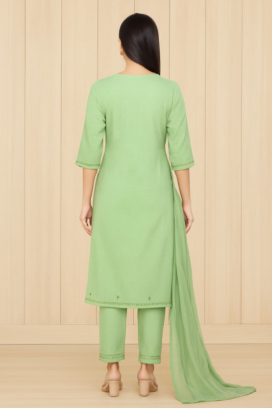 Refresh your ethnic collection with this beautiful light green kurta set, crafted from soft and breathable cotton fabric. Featuring delicate blue thread embroidery on the neckline and scattered motifs, this kurta offers a graceful and minimalistic look. The straight-fit design with 3/4th sleeves makes it both comfortable and stylish for everyday wear. Paired with matching pants featuring embroidered hem and a light green dupatta, this set is a perfect blend of elegance and comfort.