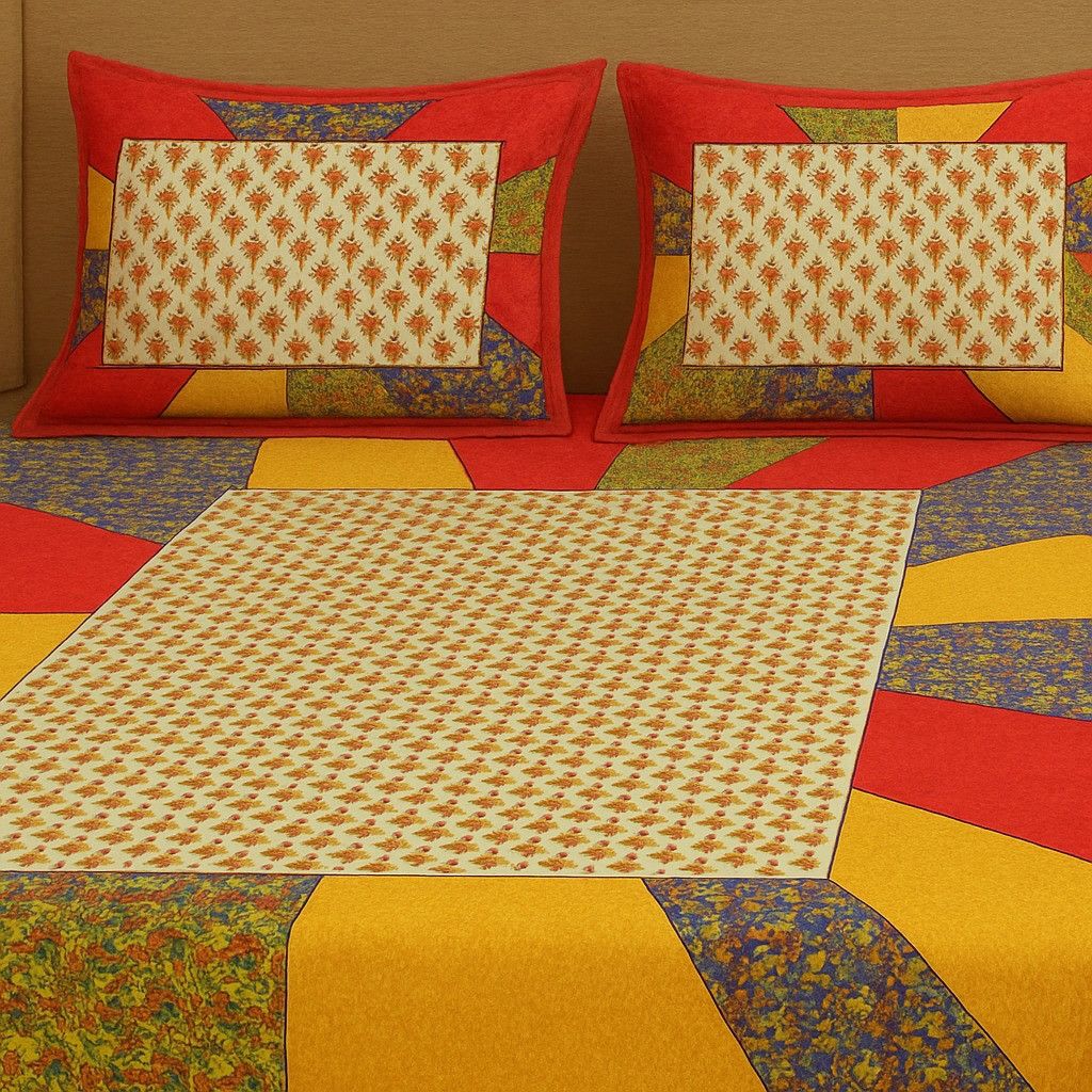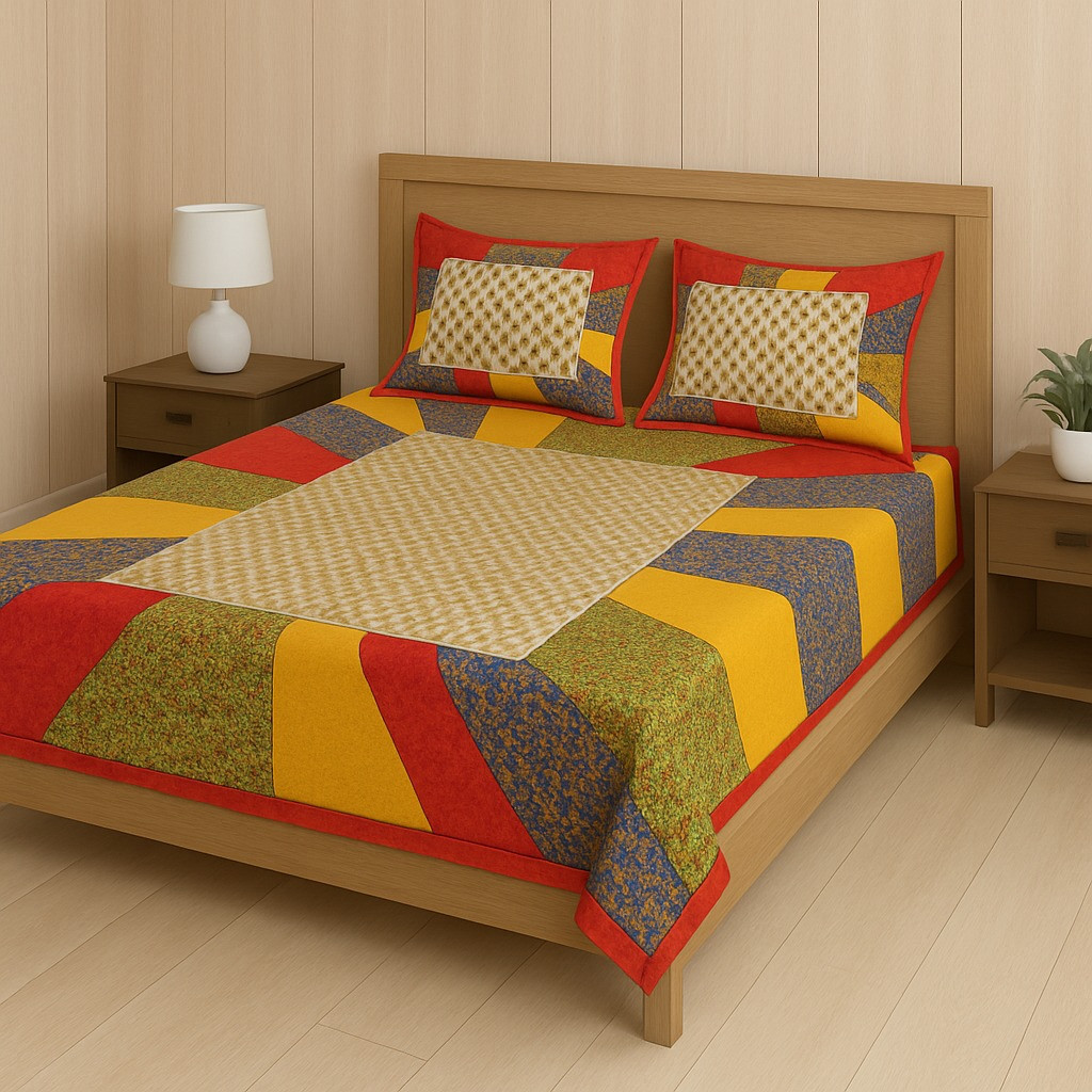 Brighten up your bedroom with this vibrant multicolor patchwork cotton double bedsheet set. Featuring bold shades of red, yellow, green, and blue with intricate patterns, this bedsheet brings a festive and lively charm to your room décor. The central floral block print contrasts beautifully with the colorful patchwork borders, giving it a unique and eye-catching appeal. Made from soft and breathable cotton, it ensures maximum comfort and durability. The matching pillow covers complete the coordinated look, making your bed the highlight of your space.