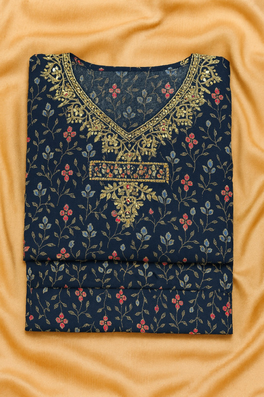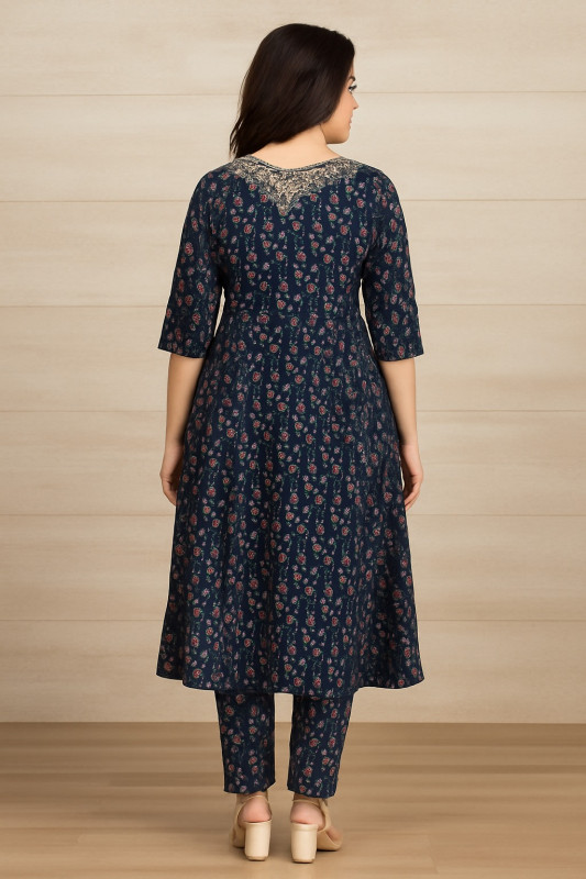 This stunning navy blue A-line dress features intricate floral patterns and elegant golden embroidery on the neckline, adding a touch of traditional charm. With a flattering empire waist and 3/4 sleeves, it provides a comfortable yet stylish fit for various occasions. The matching pants complete the set, offering a seamless, coordinated look. Made from soft, breathable fabric, this dress ensures comfort while exuding effortless style, making it ideal for festive occasions, casual gatherings, or family events.