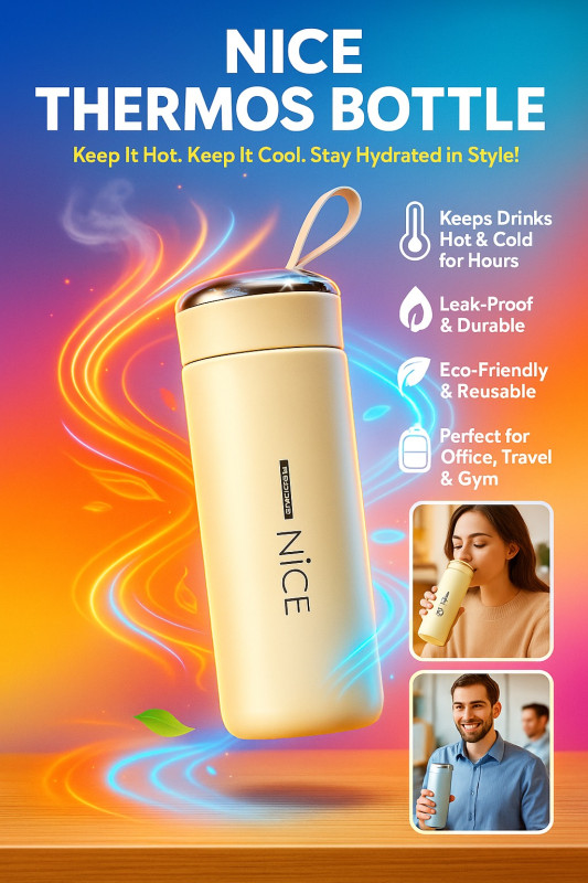 Stay hydrated in style with the NICE Thermos Bottle – designed to keep your beverages hot or cold for hours. Made with high-quality, eco-friendly, and reusable material, this thermos is perfect for daily use whether at the office, gym, or during travel. Its leak-proof design ensures no spills, while the sleek look and durable body make it both practical and fashionable. With an easy-carry strap and compact design, this bottle is your ideal hydration partner for any occasion.