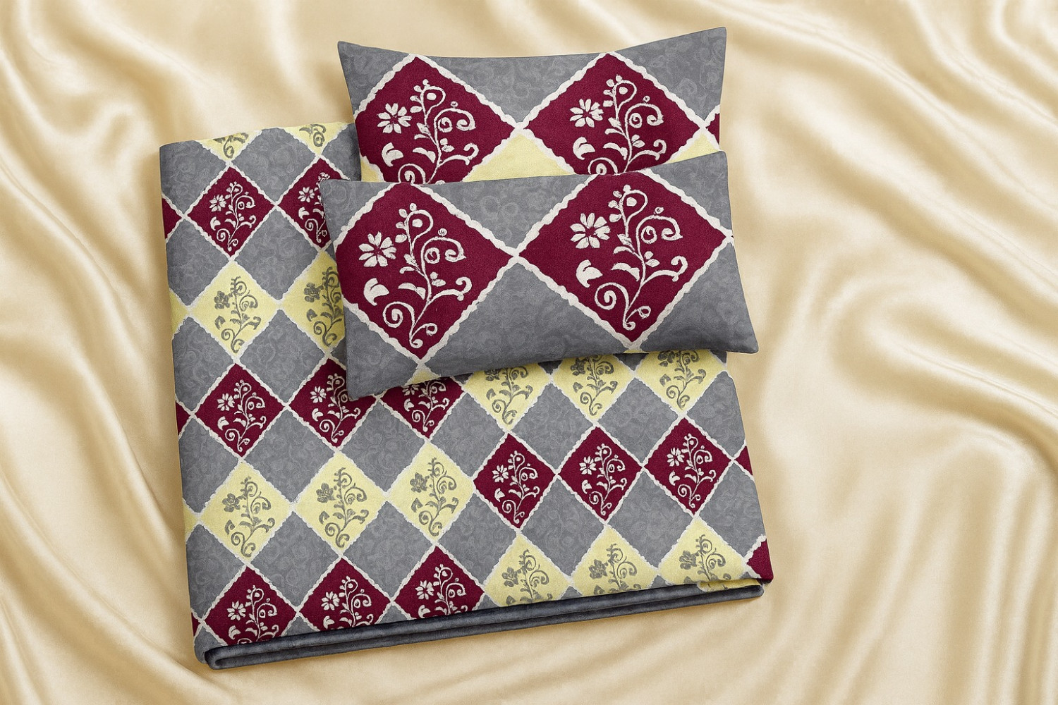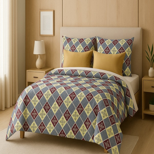 Bring elegance and comfort to your bedroom with this premium cotton double bed sheet set, designed in a modern diamond checkered pattern in shades of grey, yellow, and maroon. Crafted from high-quality cotton fabric, this bed sheet offers softness, durability, and breathability for a restful sleep.