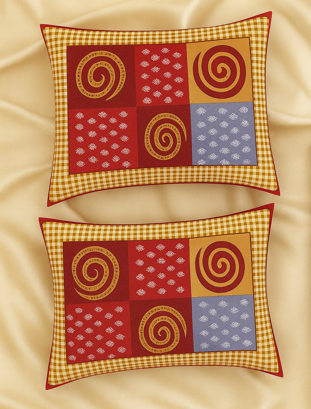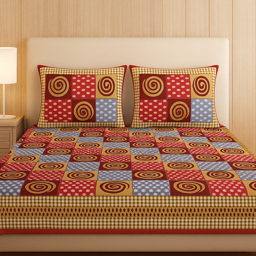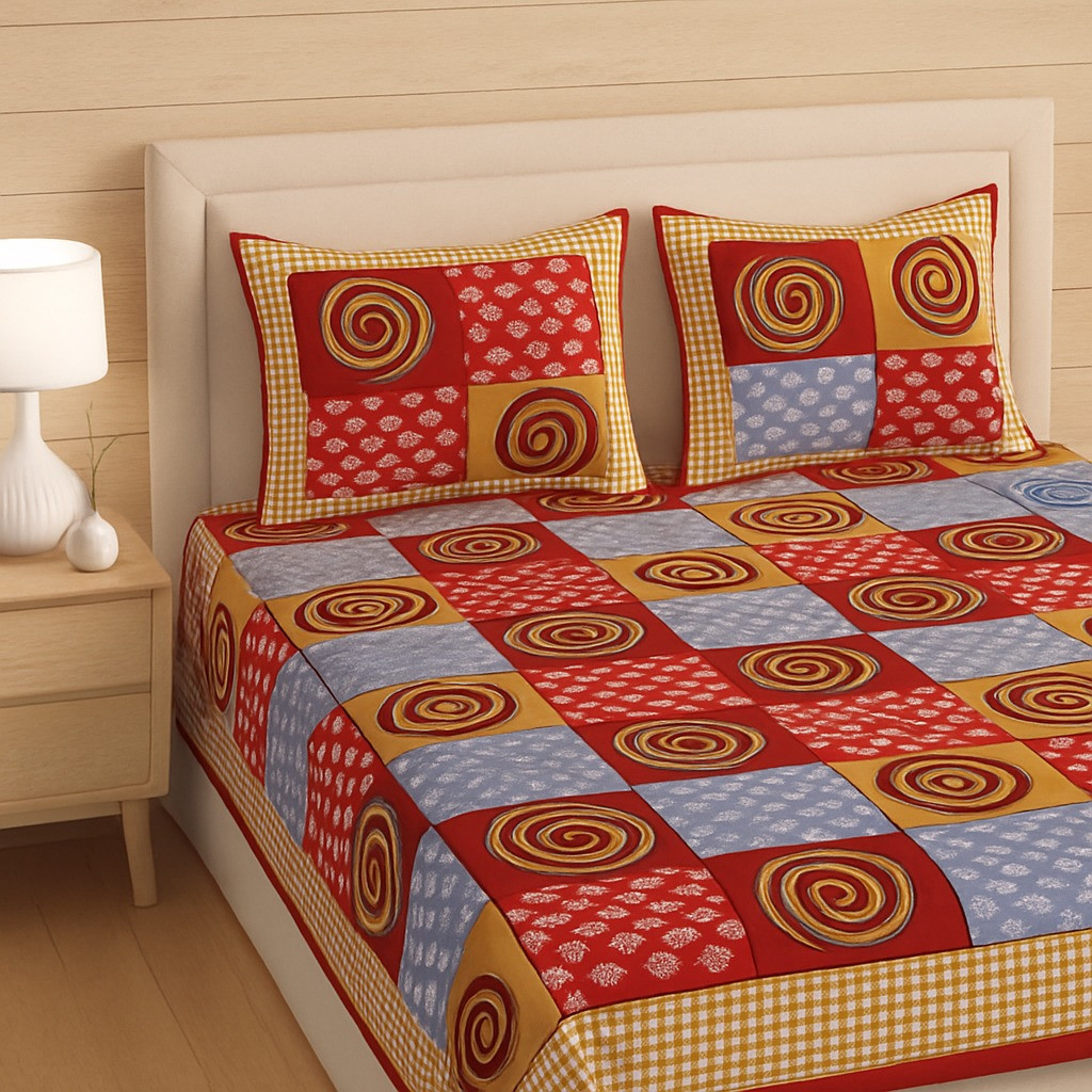 Add a vibrant touch to your bedroom with this red and blue geometric print cotton bedsheet set. Designed with a unique checkered pattern featuring spirals, dots, and bold color contrasts, this bedsheet brings a modern and artistic vibe to your space. Crafted from soft, breathable cotton fabric, it ensures lasting comfort and durability. The coordinated pillow covers with matching geometric prints enhance the overall look, making your bed stylish and eye-catching.