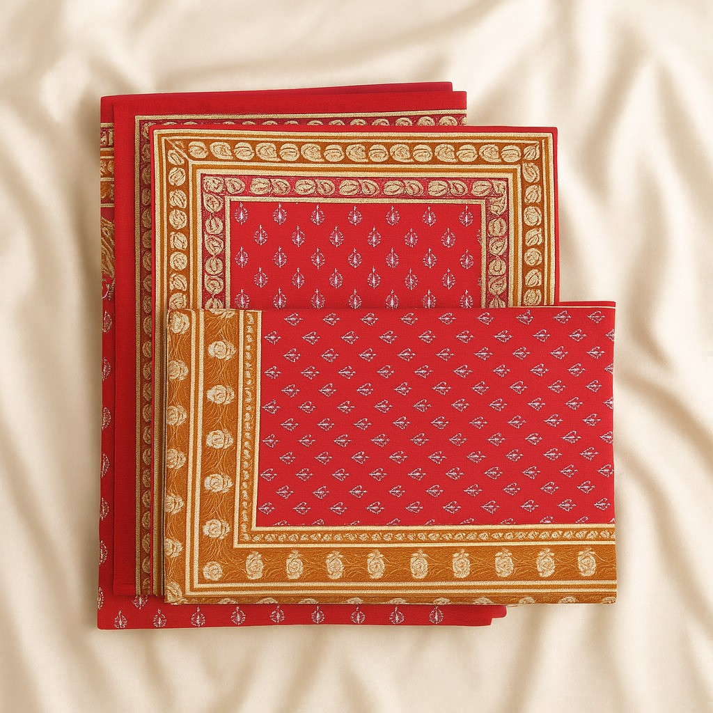 Red & Golden Border Cotton Double Bed Sheet with Pillow Covers