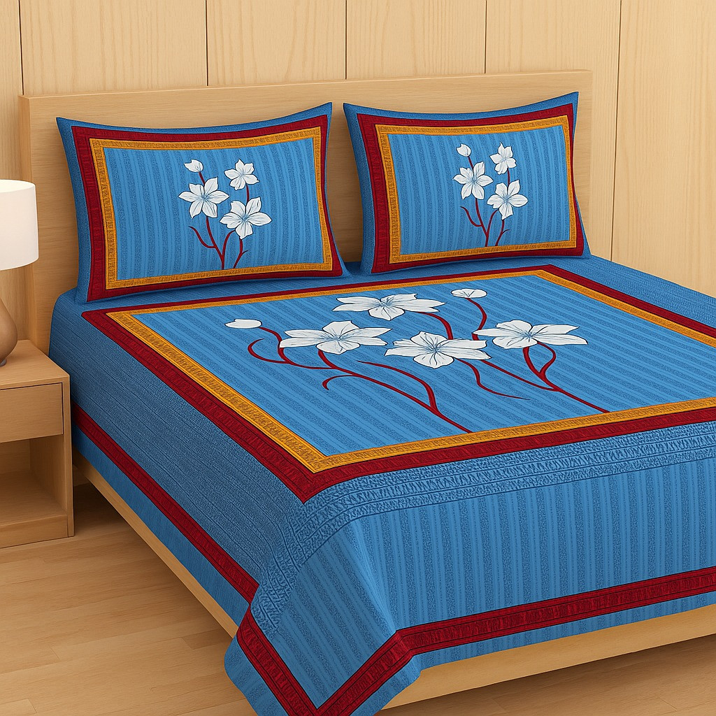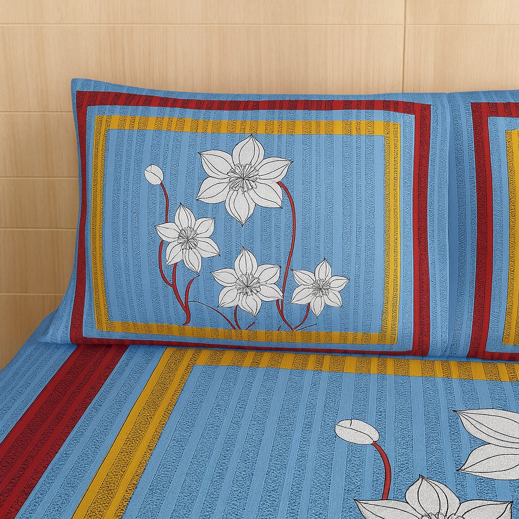 Add a refreshing touch of elegance to your bedroom with this sky blue floral cotton bedsheet set. Designed with a modern striped background and large white flower motifs framed with red and yellow borders, this bedsheet brings a perfect balance of simplicity and vibrancy to your home décor. Made from soft and breathable cotton fabric, it ensures comfort and durability for everyday use. The matching pillow covers with the same floral design complete the coordinated look, making your bed stylish and inviting.