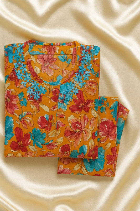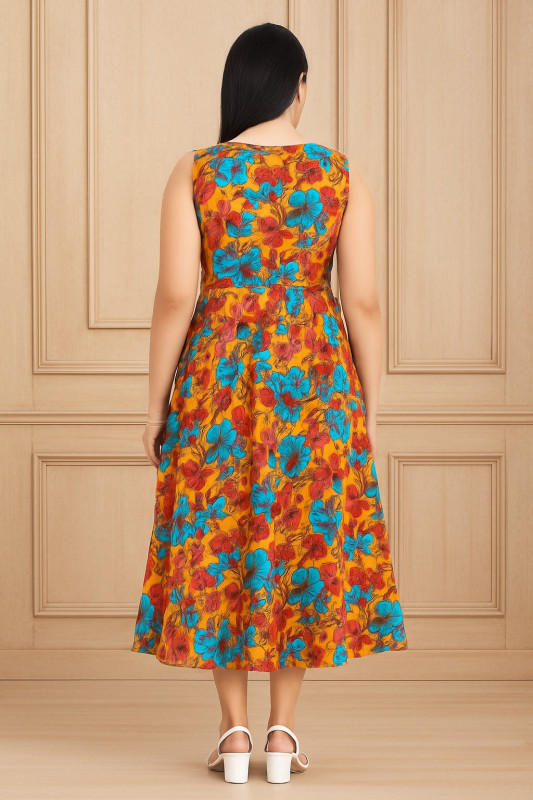 Step into effortless elegance with this Sleeveless Multicolor Floral A-Line Dress. Designed with vibrant shades of red, blue, and orange floral prints on a mustard-yellow base, this dress is perfect for summer and spring. The sleeveless design with a round neckline adds a modern charm, while the cinched waist with delicate lace detailing enhances the feminine silhouette. Crafted from lightweight, breathable fabric, it ensures maximum comfort for all-day wear. This ankle-length A-line dress is perfect for casual outings, brunches, vacations, and festive gatherings.