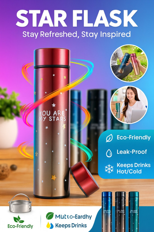 Bring charm and utility together with the Star Flask – “You Are My Stars” Edition. Designed with a celestial star pattern and inspiring message, this premium stainless steel flask not only keeps your drinks hot or cold for hours but also uplifts your mood every time you sip.