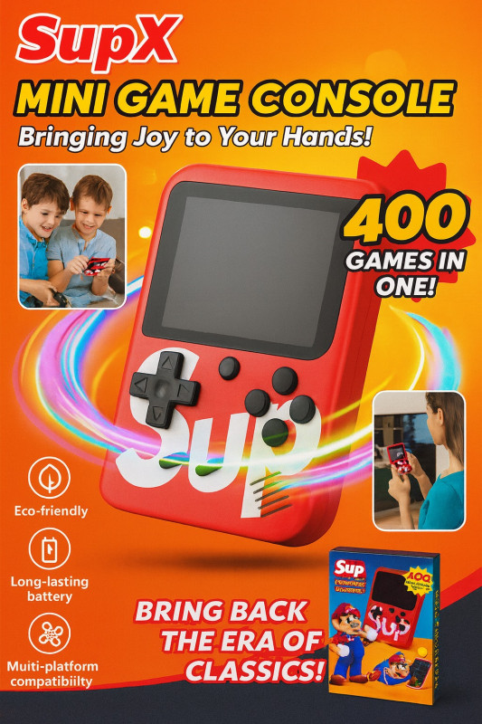 Bring back the golden era of gaming with the SupX Mini Game Console! Packed with 400 built-in classic retro games, this pocket-sized console is pure nostalgia and endless fun for kids and adults alike. Its vivid screen, long-lasting battery, and lightweight design make it perfect for gaming anytime, anywhere – whether at home, while traveling, or with friends.