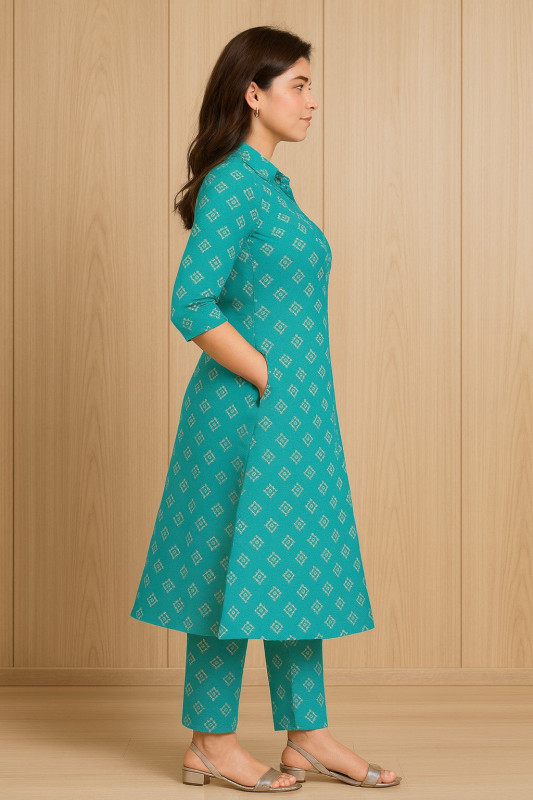 Elevate your everyday style with this elegant teal blue cotton kurta set. Designed with a classic collared neckline and three-quarter sleeves, this kurta features a subtle all-over geometric print that blends tradition with modern charm. The straight-fit pants in a matching print complete the coordinated look, making it perfect for both casual outings and office wear. Crafted from breathable cotton fabric, this outfit ensures all-day comfort without compromising on style.