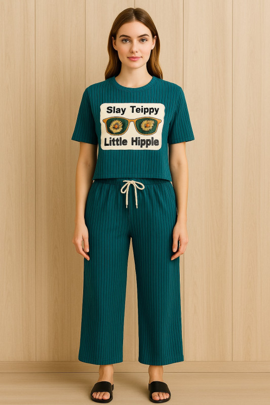 Stay stylish and comfortable with this teal green ribbed women’s coord set, perfect for casual outings, travel, or lounging. Made from soft stretchable ribbed fabric, this set includes a half-sleeve crop top and wide-leg pants, offering a chic and relaxed fit.
