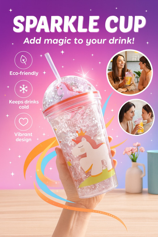 Bring a touch of magic to your drinks with this Unicorn Sparkle Cup! Featuring a cute unicorn design with glittering stars inside the double-wall, this tumbler is both stylish and practical. Made with eco-friendly materials, it helps keep your beverages cold while adding a vibrant sparkle effect. Perfect for kids, teens, or anyone who loves unicorns, this cup comes with a secure dome lid and reusable straw for mess-free sipping.