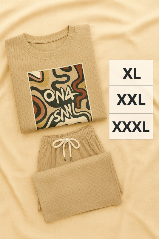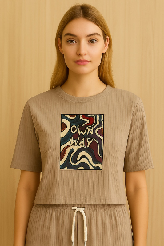 Stay trendy and comfortable with this beige co-ord set, designed for modern casual fashion. The set includes a short-sleeved crop top and wide-leg trousers, both crafted from soft, textured fabric that ensures breathability and ease of movement.