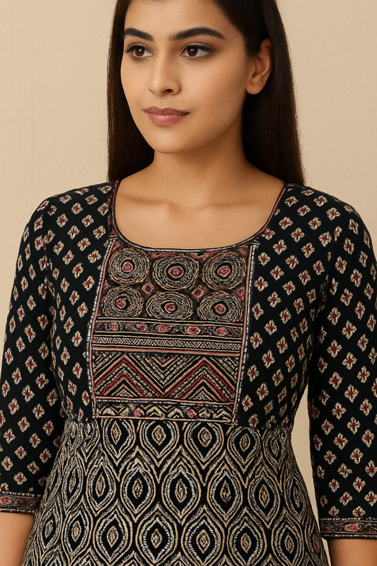 Make a bold and elegant statement with this black and beige printed Anarkali kurta, crafted with intricate geometric motifs for a sophisticated ethnic look. The kurta features a round neckline, 3/4th sleeves, and a beautifully detailed contrasting yoke design with tribal-inspired patterns in earthy tones.