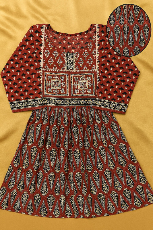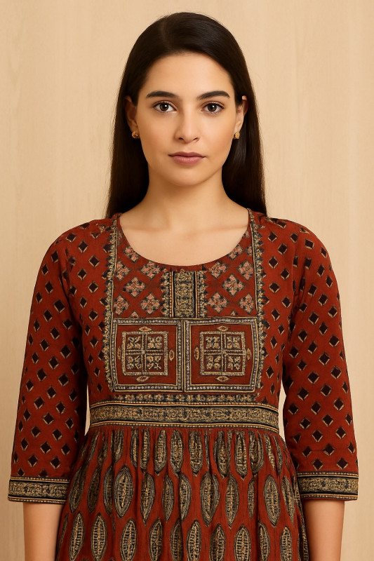 The front yoke is detailed with intricate block-style prints, while the sleeves and tiered layers are highlighted with complementary ethnic motifs. Its earthy tones of brown, black, and beige make it versatile for festive occasions, casual outings, or office wear.