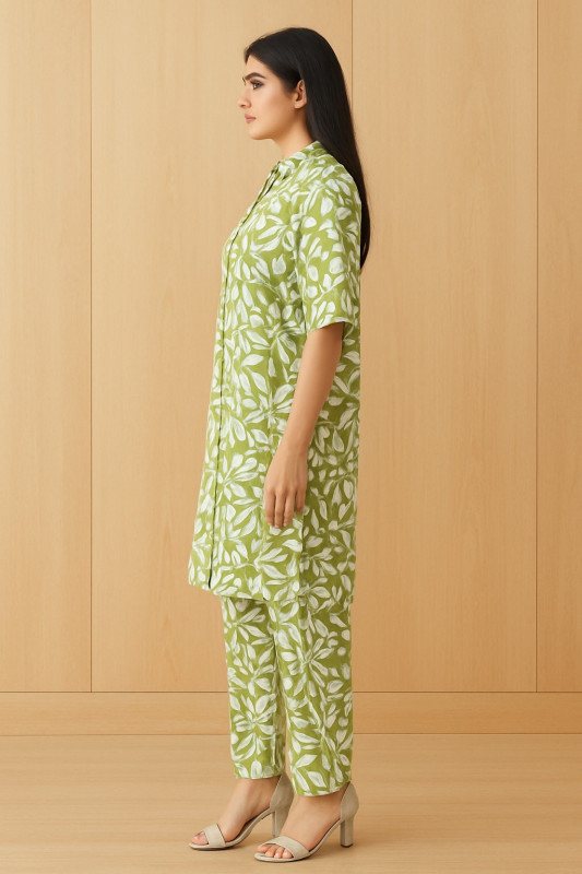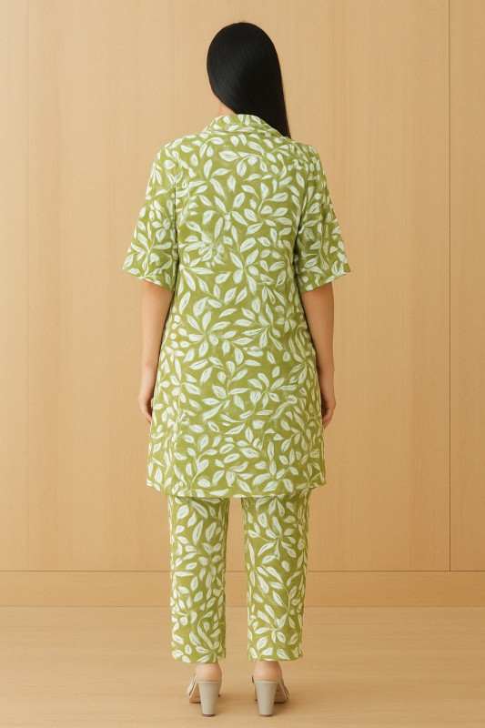 The highlight of this set is the all-over white leaf print on a vibrant green base, creating a refreshing and nature-inspired design. The matching straight-fit pants complete the coordinated look, making it perfect for office wear, casual outings, or daily comfort wear.