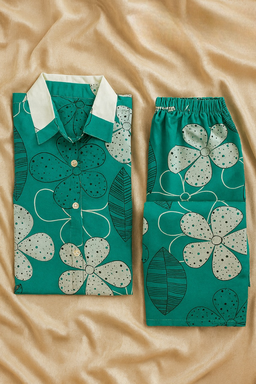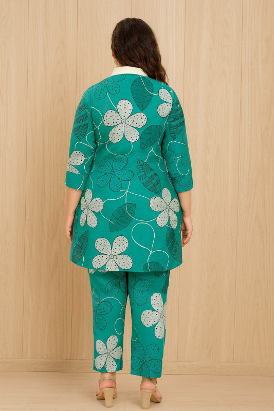 Step into comfort and style with this elegant green printed kurta set, perfect for casual wear, office wear, and daily outings. Crafted from soft, breathable cotton fabric, this outfit ensures all-day comfort while keeping you fashionable. The kurta features a classic shirt collar, 3/4th sleeves, and side slits for easy movement. Paired with matching straight-fit pants, the set is designed with large floral prints in contrasting shades, making it eye-catching and trendy.