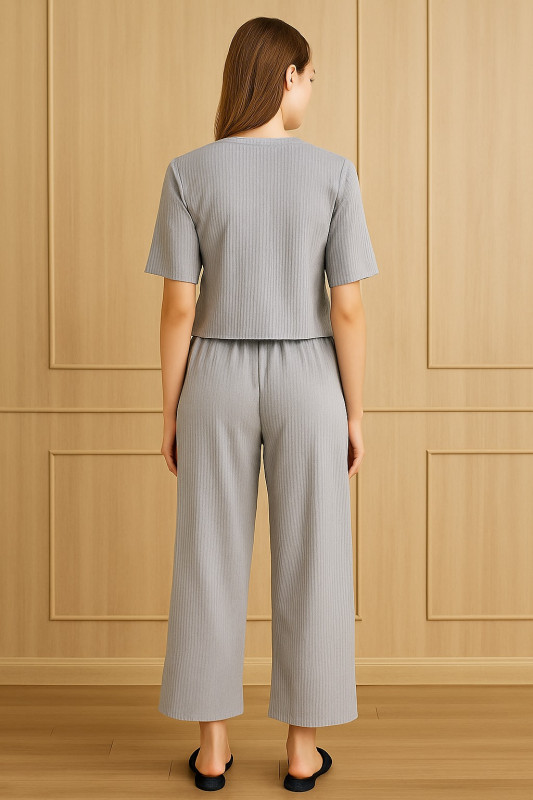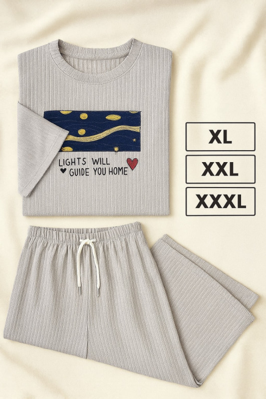 Stay effortlessly stylish and comfortable with this women’s grey co-ord set, perfect for both casual outings and lounging in style. The set includes a trendy half-sleeve printed T-shirt with a round neckline, featuring a chic abstract graphic with the quote “Lights Will Guide You Home”. Paired with elastic waist wide-leg pants and an adjustable drawstring for a relaxed yet secure fit, this outfit offers a perfect balance of fashion and ease.