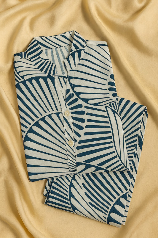 It features a shirt-style collar neckline with button-down detailing, 3/4th sleeves, and a straight-fit silhouette that gives a sleek and polished look. The overall design showcases large teal floral-inspired abstract prints on a subtle grey base, making it both eye-catching and versatile for casual outings, office wear, and daily styling.