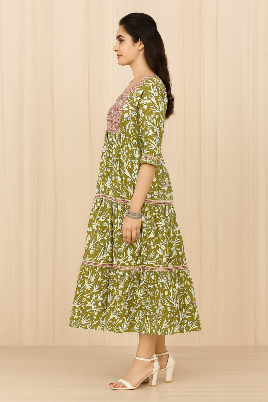 Add charm to your ethnic collection with this olive green tiered Long Grown dress, designed with beautiful floral and leafy prints. Crafted from lightweight, breathable fabric, this kurta ensures all-day comfort while giving a stylish ethnic look.