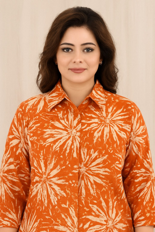 The all-over bold white burst floral print on a vibrant orange base adds a lively and eye-catching appeal. It comes with matching straight-fit pants, making it a complete outfit suitable for casual outings, office wear, or daily comfort.