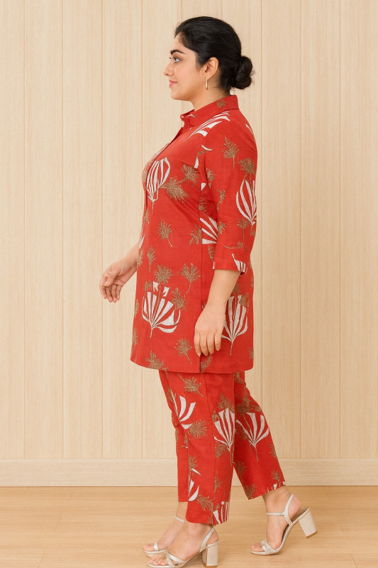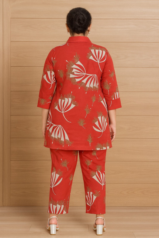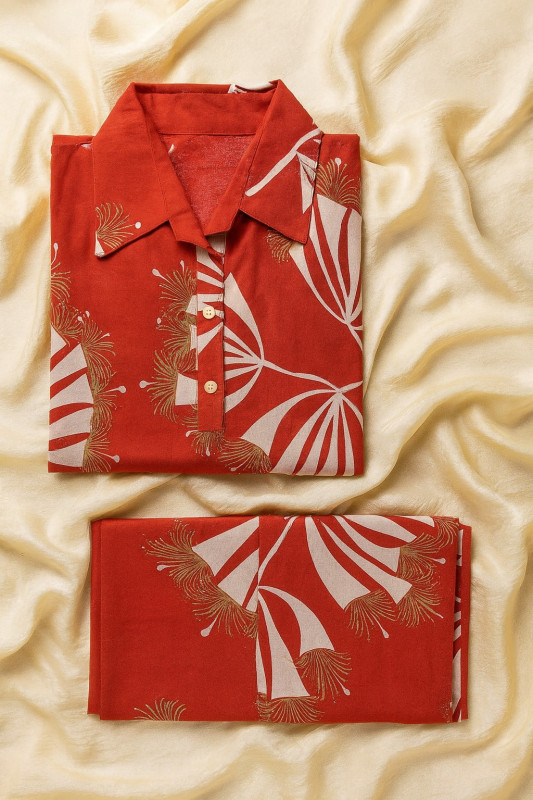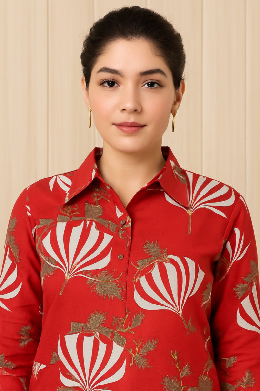 Step into style with this red abstract floral printed kurta set, crafted in soft, breathable cotton fabric for all-day comfort. The kurta features a shirt-style collar, button placket, and 3/4th sleeves, giving it a modern yet ethnic appeal.