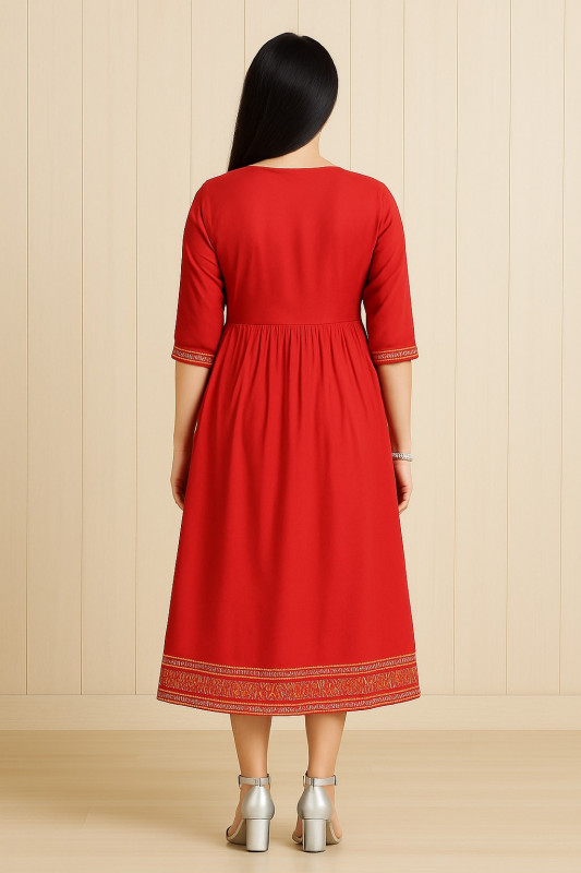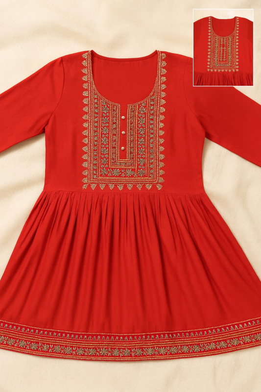 Add timeless elegance to your ethnic collection with this red embroidered Anarkali kurta dress, designed for festive occasions and everyday sophistication. Crafted from soft, breathable fabric, this kurta ensures comfort along with a graceful flow.