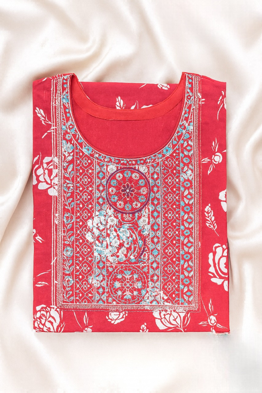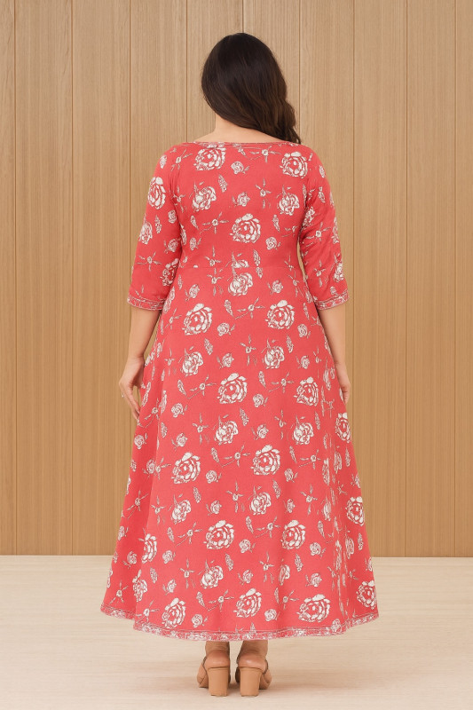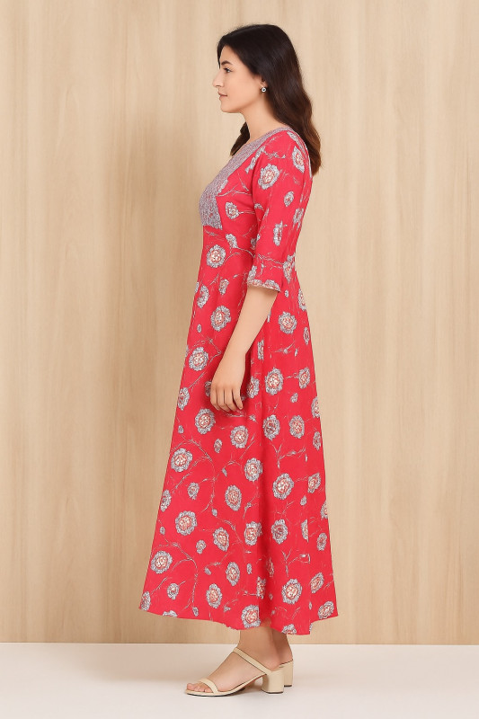 Add a touch of elegance to your ethnic wardrobe with this beautiful red Anarkali kurta, designed for comfort and style. Made from soft, breathable rayon fabric, this kurta features a round neckline with intricate printed yoke design, 3/4th sleeves, and a flared silhouette that gives a graceful flow. The overall white floral print on a vibrant red base makes it a perfect pick for festive wear, casual outings, and office gatherings.