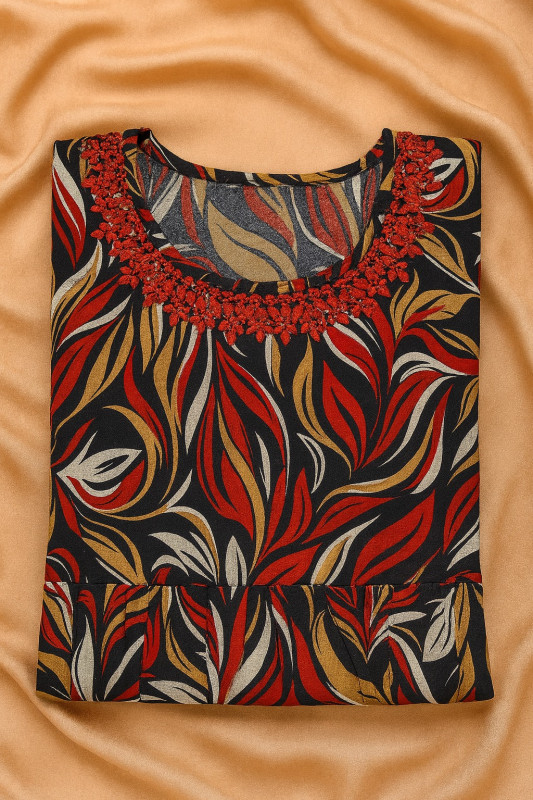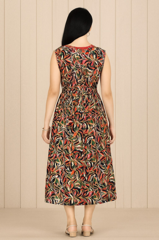 Step into elegance with this Sleeveless Black and Red Leaf Print Midi Dress. The beautiful blend of black, red, and golden leaf prints gives a rich, nature-inspired look that’s perfect for any casual outing or get-together. Featuring a flattering gathered waist and a rounded neckline with intricate embroidery, this dress exudes both comfort and style. The versatile color combination ensures that it pairs well with any accessory, making it a great choice for day-to-night wear.