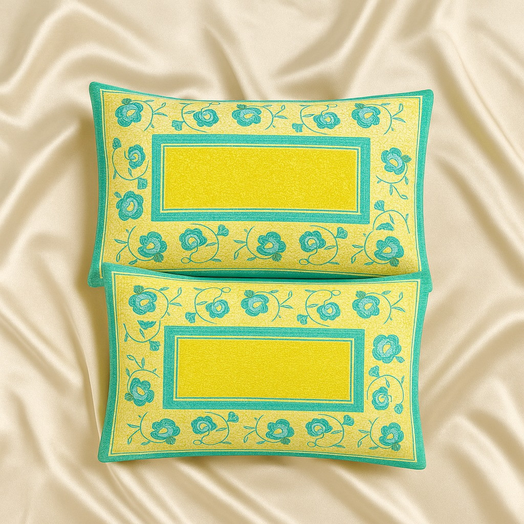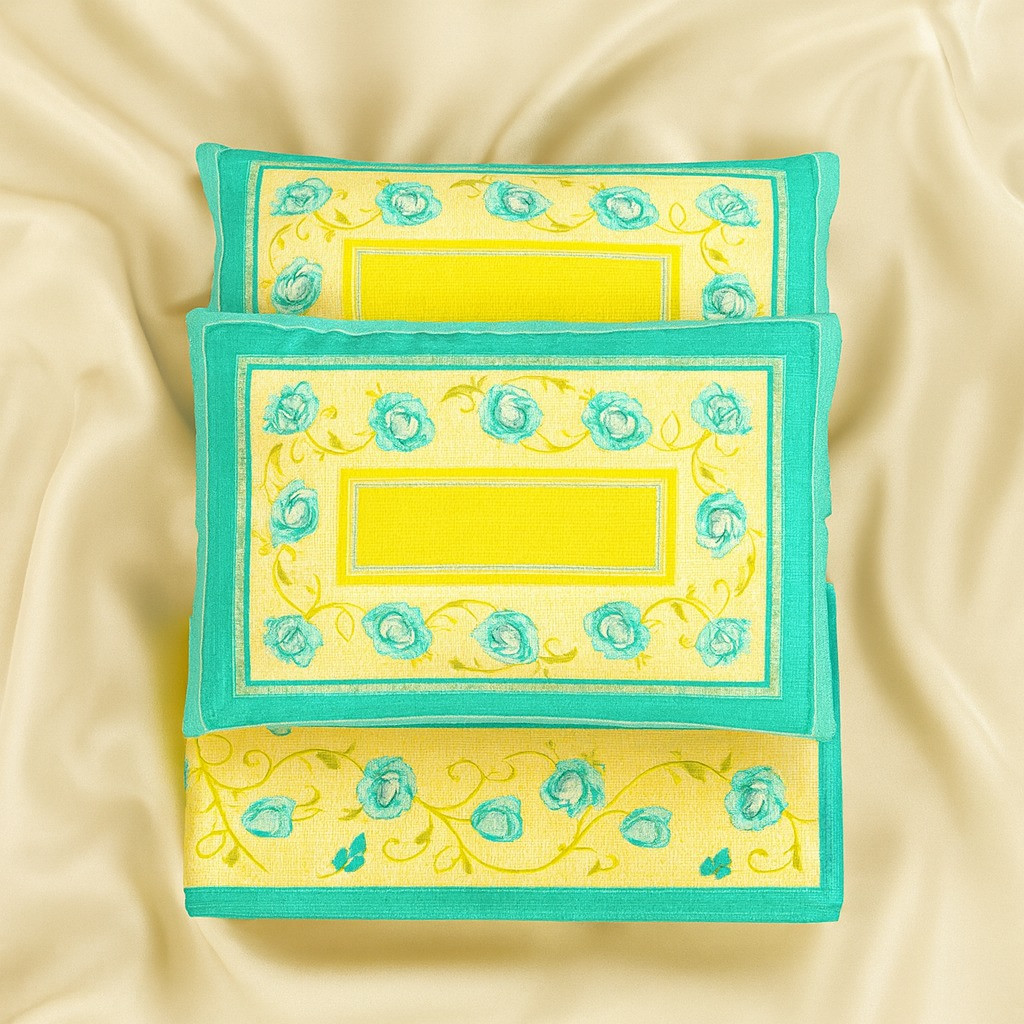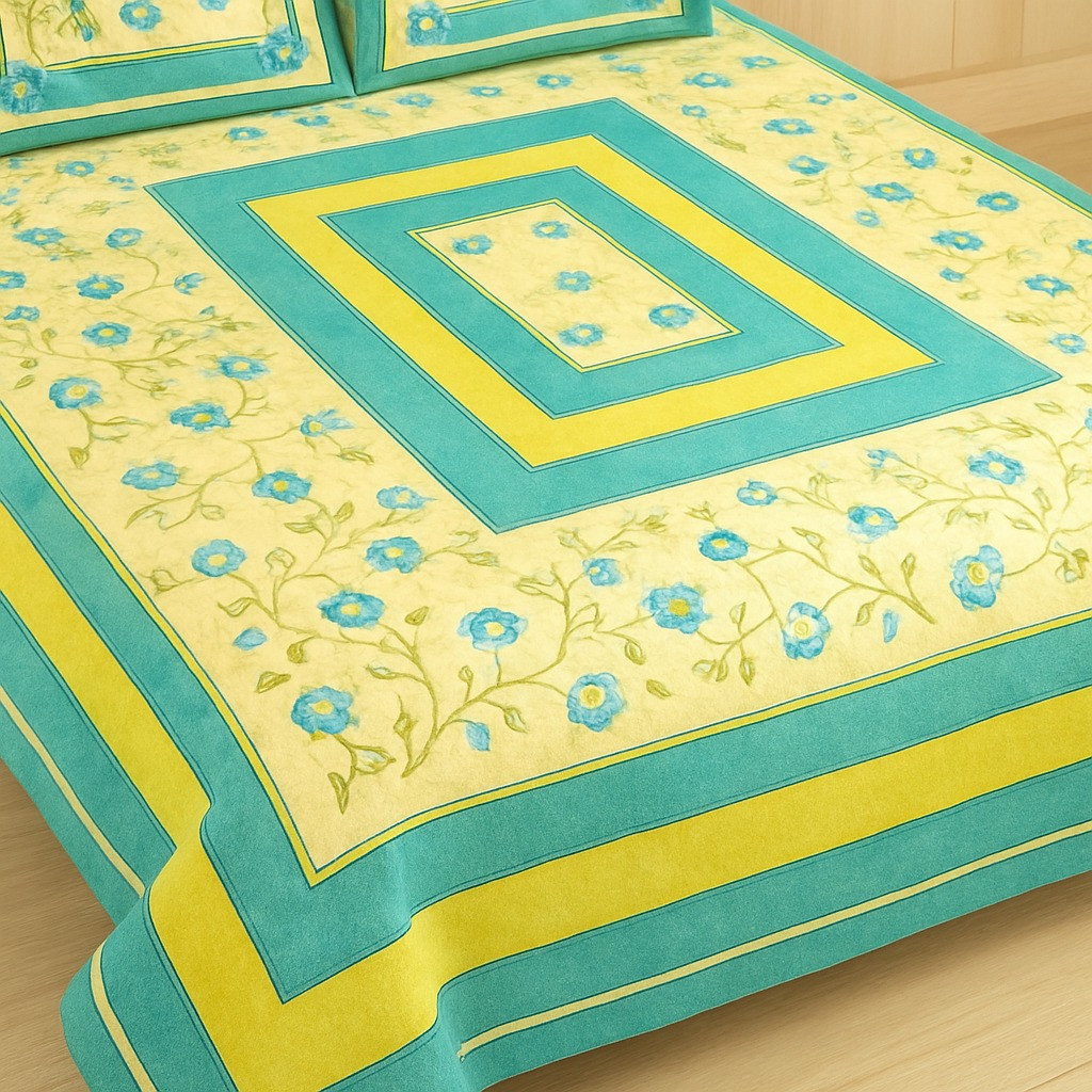 Brighten up your bedroom with this cheerful yellow and aqua blue floral cotton bedsheet set. Designed with a beautiful floral print and geometric border pattern, this bedsheet adds a vibrant and refreshing charm to your home décor. Crafted from soft and breathable cotton fabric, it ensures superior comfort and a cozy sleeping experience. The set comes with two matching pillow covers that perfectly complement the overall design, making your bed look stylish and inviting.