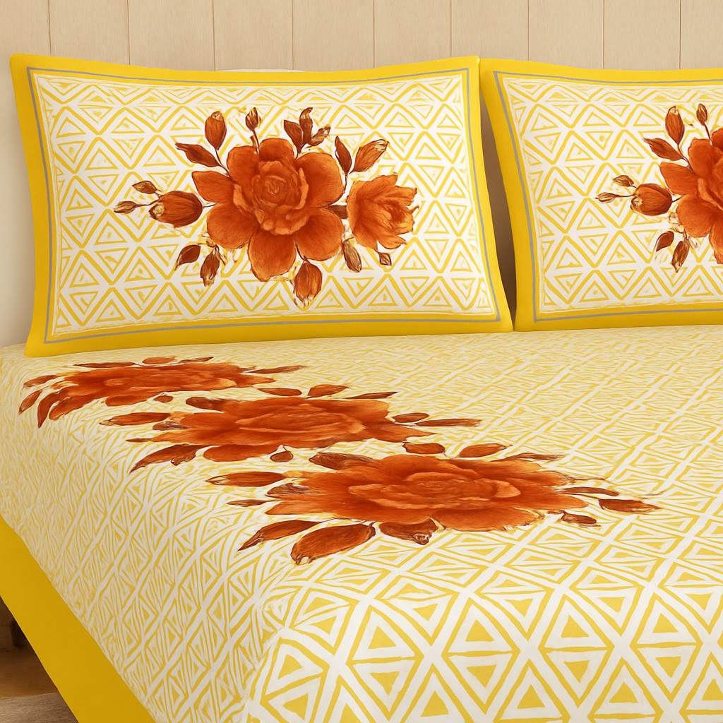 Brighten up your bedroom with this vibrant yellow floral cotton double bedsheet set. Featuring a geometric diamond background with bold red-orange floral prints, this bedsheet adds a cheerful and lively charm to your home décor. Crafted from soft, breathable cotton, it ensures maximum comfort and long-lasting durability. The set comes with two matching pillow covers showcasing striking floral motifs, completing the coordinated and stylish look.
