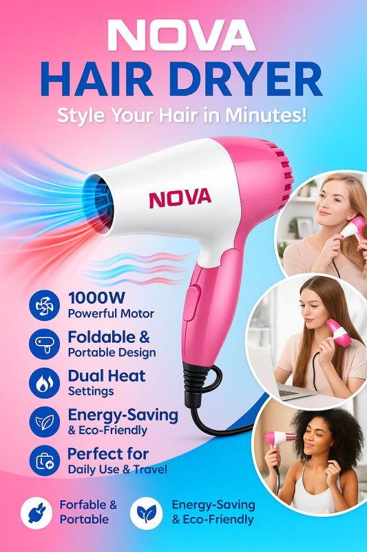 Whether it’s quick drying before work or styling for a special event, the Nova Hair Dryer gives you salon-like results at home. Portable, stylish, and powerful – it’s your go-to hair styling partner anytime, anywhere!