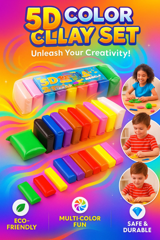 Unleash your child’s creativity with the 5D Color Clay Set – a vibrant, fun, and safe modeling clay kit perfect for endless hours of imaginative play! This colorful set includes multiple shades of soft, non-toxic clay that’s easy to mold, shape, and reuse, making it ideal for kids’ crafts, school projects, and learning activities.
