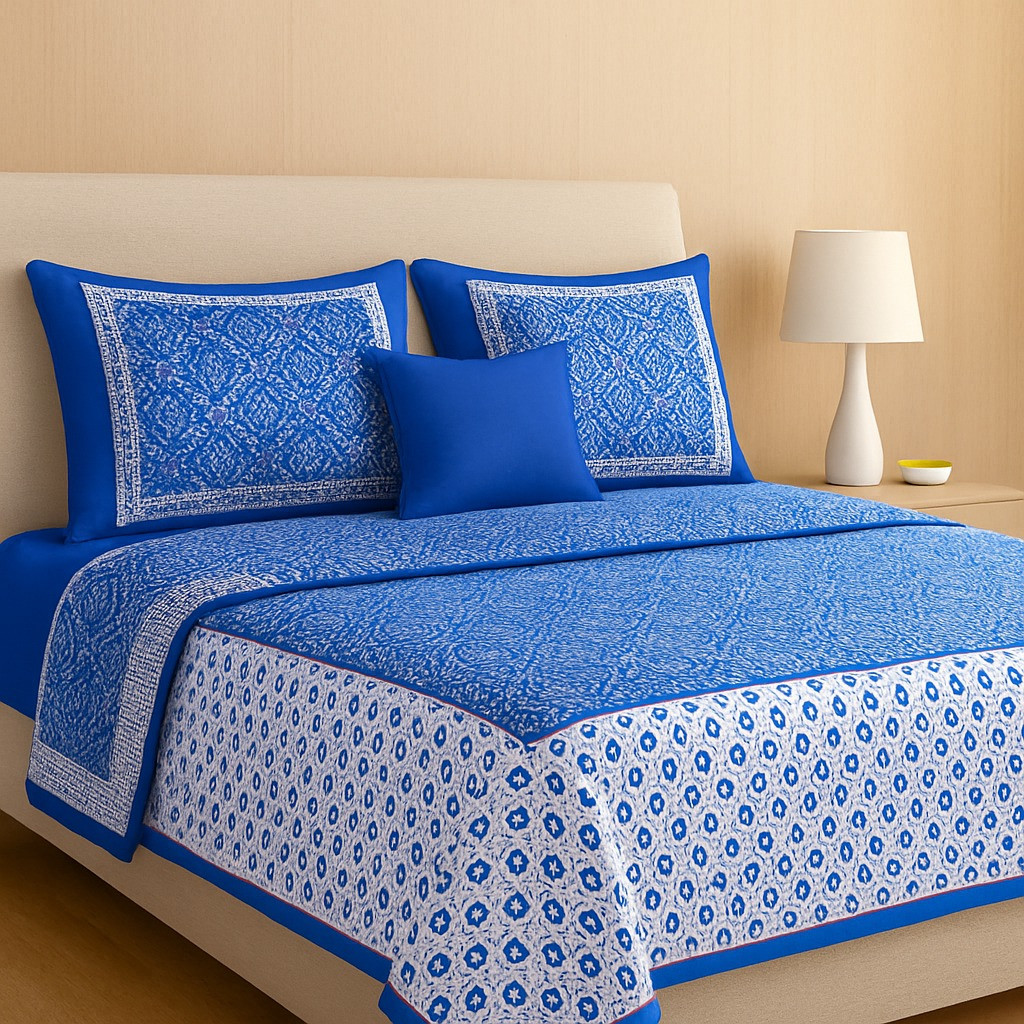 Give your bedroom a refreshing makeover with this royal blue cotton double bedsheet set. Designed with elegant dotted patterns and a floral-inspired border, this bedsheet beautifully combines traditional charm with modern simplicity. Made from soft and breathable cotton, it offers superior comfort, durability, and a restful sleep experience. The set includes two matching pillow covers with coordinated patterns to complete the look, making your bed the centerpiece of your room.