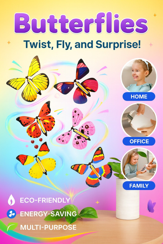 Bring magic and joy into any moment with these Colorful Flying Wind-Up Butterflies. Just twist the rubber band, release, and watch them flutter into the air like real butterflies! Perfect for kids and adults alike, these reusable butterflies are great for pranks, party favors, gifts, or simply adding fun to your day.