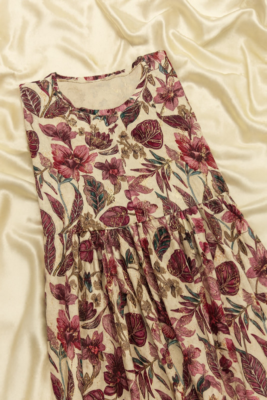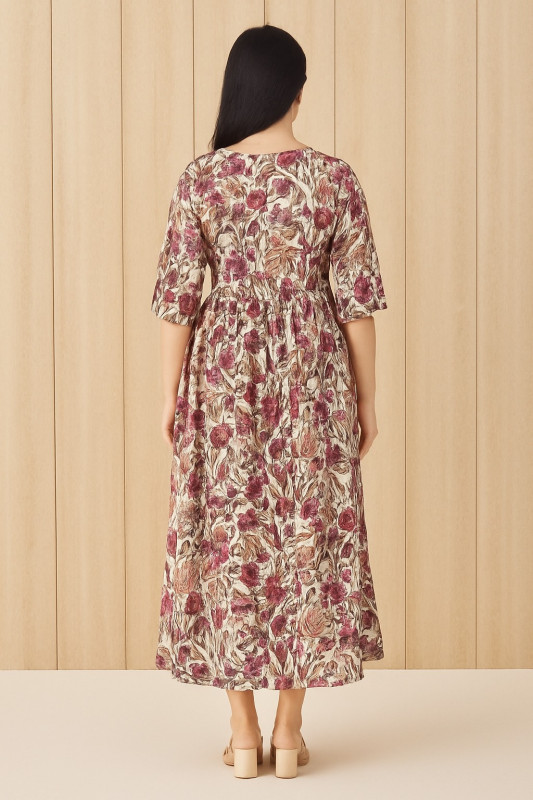 Make a chic statement with this Beige Floral Printed Maxi Dress. Designed with an all-over maroon and brown floral pattern, this dress radiates elegance and sophistication. Featuring a round neckline, half sleeves, and a flowy maxi length, it offers both style and comfort. Crafted from breathable fabric, this dress is perfect for casual outings, festive occasions, and everyday wear. Its flattering silhouette enhances your look while keeping you effortlessly graceful.